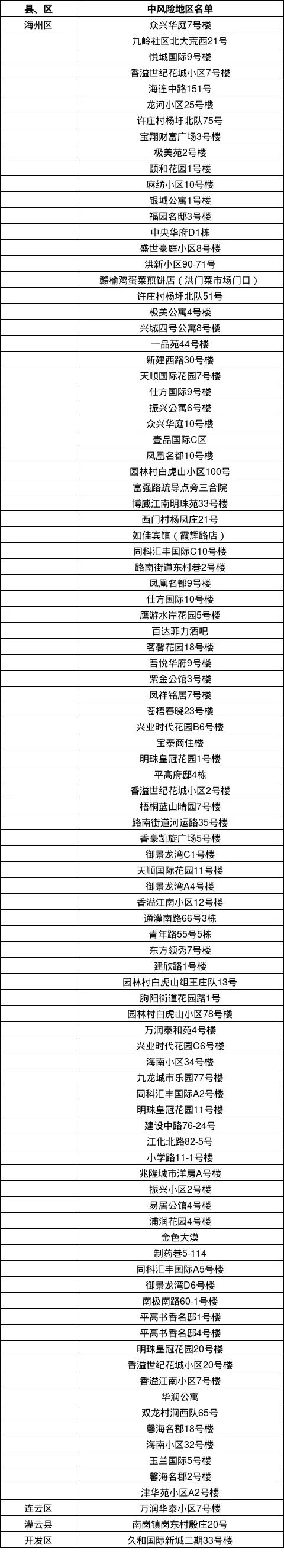 連云港市中風(fēng)險(xiǎn)地區(qū)(96個(gè))
