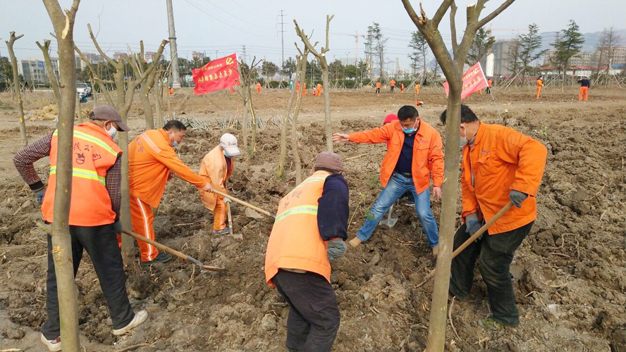 為保證植樹質量,該公司配備多名專業(yè)技術人員進行全程技術指導。上午8時許,在移苗現(xiàn)場,一臺挖掘機轟隆隆地作業(yè)著,小心翼翼的將一棵棵大樹苗連根拔起,在保證不擠壓的情況下,輕抬輕放,裝苗運輸。在栽苗活動現(xiàn)場,全體工作人員戴好頭罩、手套等防護用具,在統(tǒng)一指揮下,彼此間隔1米左右,擼起袖子、揮著鐵鍬、扛著鋤頭飛快地投入到栽苗植樹作業(yè)中。大家分工協(xié)作,有的開槽挖坑;有的栽植樹苗;有的抬木扶苗;有的回填新土;有的纏繩護樹;有的澆水保濕……到處都是忙碌的身影,整個植樹活動現(xiàn)場一片熱火朝天的繁忙景象。放眼望去,在明媚的春光中,一排排新栽下的樹苗迎風挺立,生機勃勃,組成了一道道靚麗的風景線。