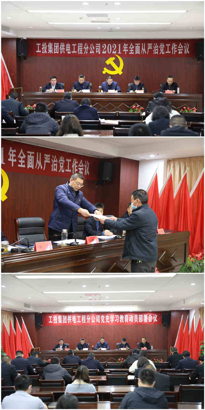 上半場(chǎng),在公司2021年全面從嚴(yán)治黨工作會(huì)議上,全體參會(huì)人員首先觀看了全面從嚴(yán)治黨工作警示教育片。隨后,黨委書記、經(jīng)理孫政權(quán)在題為《強(qiáng)化政治建設(shè) 聚焦深度融合 以大黨建引領(lǐng)公司高質(zhì)量發(fā)展新征程》的黨委工作報(bào)告中指出,過去的一年,面對(duì)新冠疫情和經(jīng)濟(jì)下行的雙重壓力,公司黨委深入學(xué)習(xí)貫徹習(xí)近平新時(shí)代中國特色社會(huì)主義思想,以“不忘初心、牢記使命”主題教育為主線,扎實(shí)開展“雙融雙創(chuàng)”黨內(nèi)主題教育實(shí)踐活動(dòng),壓實(shí)管黨治黨責(zé)任、勇于直面困難挑戰(zhàn),推動(dòng)公司經(jīng)濟(jì)在逆境中取得突破,黨建工作取得了顯著成效。報(bào)告強(qiáng)調(diào),2021年黨委工作的指導(dǎo)思想是:深入學(xué)習(xí)貫徹習(xí)近平新時(shí)代中國特色社會(huì)主義思想、十九屆五中全會(huì)精神等內(nèi)容,以“全面從嚴(yán)治黨”為統(tǒng)領(lǐng),以“黨史學(xué)習(xí)教育”為主線,以打造“工電先鋒”黨建品牌為抓手,扎實(shí)開展“奮進(jìn)新時(shí)代、領(lǐng)航開新篇”黨內(nèi)主題教育活動(dòng),以“大黨建”整合力量、凝聚人心,發(fā)揮黨的關(guān)鍵引領(lǐng)作用,將黨的政治優(yōu)勢(shì)轉(zhuǎn)化為發(fā)展優(yōu)勢(shì)。團(tuán)結(jié)帶領(lǐng)廣大干部員工,統(tǒng)一思想、凝聚力量,勇于擔(dān)當(dāng)、開拓進(jìn)取,加大改革創(chuàng)新、轉(zhuǎn)型升級(jí)、管理提升推動(dòng)力度,開創(chuàng)工投供電高質(zhì)量發(fā)展新局面,以改革發(fā)展優(yōu)異成績向建黨100周年獻(xiàn)禮,為扛起“爭當(dāng)表率、爭做示范、走在前列”重大使命、奪取“十四五”發(fā)展開局首勝作出貢獻(xiàn)。圍繞上述總體要求,重點(diǎn)做好五個(gè)方面工作:持續(xù)深化政治建設(shè),推進(jìn)黨建經(jīng)濟(jì)深度融合;持續(xù)強(qiáng)化基層基礎(chǔ),構(gòu)建企業(yè)大黨建格局;持續(xù)推進(jìn)人才隊(duì)伍建設(shè),增強(qiáng)高質(zhì)量發(fā)展推動(dòng)力;持續(xù)推進(jìn)黨風(fēng)廉政建設(shè),推進(jìn)全面從嚴(yán)治黨向縱深發(fā)展;持續(xù)推進(jìn)和諧企業(yè)創(chuàng)建,維護(hù)和諧穩(wěn)定發(fā)展的良好局面。