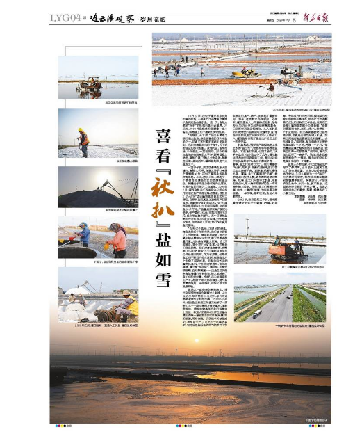 扒鹽現場,指揮生產的程龍是土生土長的“鹽三代”,爸爸和爺爺都是老鹽場人。“和鹽場打交道,心里才踏實?!贝髮W畢業(yè)后,在外地工作了幾年,程龍最終還是決定回到鹽場工作。程龍說,純手工扒鹽的年代,鹽工們都很辛苦——春季,鹽工們迎來“大忙”。他們需要防“地漏”,用石拱、壓割機把池底壓實,防止鹵水滲透下去。緊接著,就要忙春季扒鹽。夏季,鹽工們需要防“天漏”,提前將鹵水放進土塘,避免降雨將鹵水稀釋。秋季,鹽工們開始手工扒鹽,用扁擔挑鹵水,用小推車把曬好的鹽一車車推到船上運走。冬季,鹽工們需要對溝道、池埝、土塘進行修復,為來年春天做準備。一年四季,循環(huán)往復,鹽場人辛勤勞作。