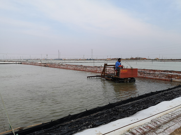 破碴勤、破碴透,才能保證原鹽生產(chǎn)的旺產(chǎn)增收。進入2月下旬,雖然受新冠肺炎疫情影響,相關工作較往年延遲,但新河制鹽分公司科學組織,嚴密安排,根據(jù)春季扒鹽節(jié)奏,合理調配破碴機械,率先啟動原鹽破碴工作。在十班破茬碴現(xiàn)場,班組結晶池內熱火朝天,只見一臺臺破碴機快速來回穿梭,正在對擬春扒格塊進行機械破碴。勞模創(chuàng)新工作室成員、班長匡洪忠查看破碴的鹽池板后,臉上露出滿意的微笑,他說:“通過近幾年的小改小革,現(xiàn)在機械破碴格塊只要一個小時就全部到位,而且質量比人工破碴好,大大地減輕了職工勞動負荷。”