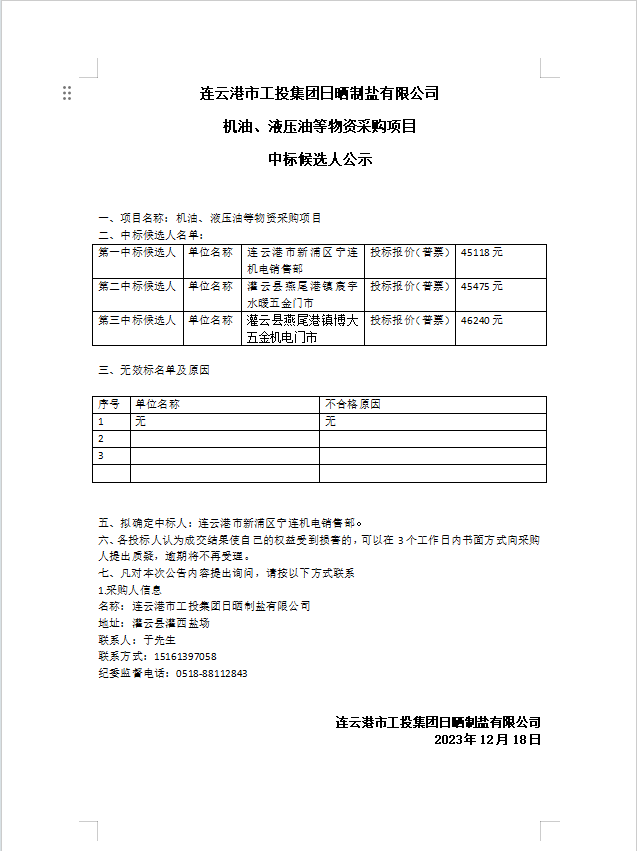 連云港市工投集團(tuán)日曬制鹽有限公司 機(jī)油、液壓油等物資采購(gòu)項(xiàng)目中標(biāo)候選人公示
