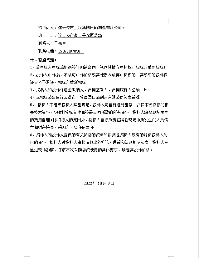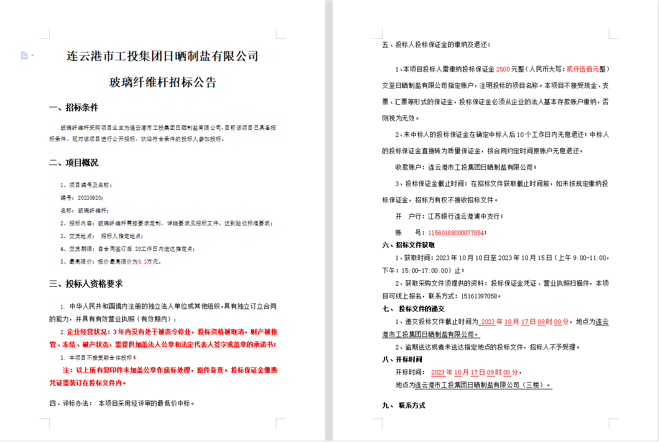 連云港市工投集團日曬制鹽有限公司 玻璃纖維桿招標(biāo)公告