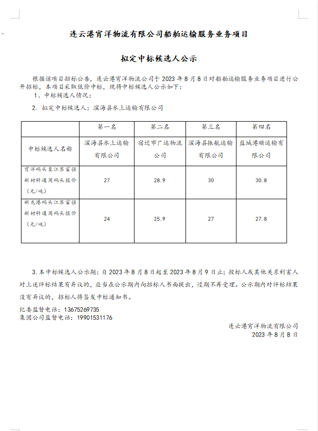 連云港宵洋物流有限公司船舶運(yùn)輸服務(wù)業(yè)務(wù)項(xiàng)目擬定中標(biāo)候選人公示