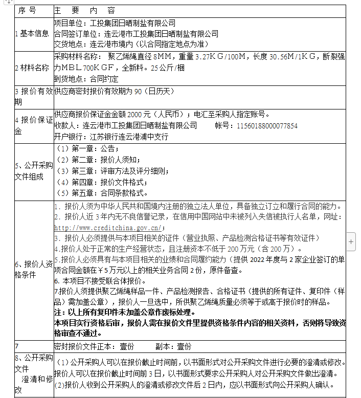 連云港市工投集團(tuán)日曬制鹽有限公司聚乙烯繩采購(gòu)項(xiàng)目