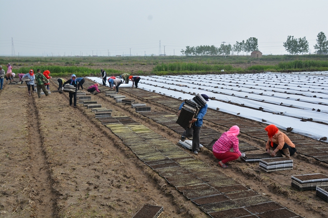 種糧大戶俞正猛正在張羅工人們擺盤育秧。運盤、擺盤、覆膜、壘土,工人們或快速或仔細地高效運轉(zhuǎn)著,三輛三輪車前后停在田埂上,車上整齊的擺放著數(shù)以萬盤的暗化苗,這些暗化苗來自生態(tài)種養(yǎng)中心育秧大棚,硬盤里面一層軟盤放入基質(zhì),撒入稻種,在大棚里通過一定的溫度和濕度的科學(xué)管理,出芽后運送到各個田頭。男工負責(zé)把硬盤在秧板上均勻放好,再由心細的女工把軟盤從硬盤上拿出擺放在秧板地上,一條秧板擺完,立刻蓋上無紡布薄膜,就地挖土壓住防風(fēng),保護好秧苗不被曬傷。空的硬盤運到田邊由專人整理回收最后運回生態(tài)種養(yǎng)中心。全部擺完以后上好水,一整套工序就算完成。不到一天時間,一萬多盤秧盤已經(jīng)被工人們?nèi)粩[完。