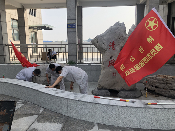 炎熱的天氣下,志愿者們不怕苦,不怕累,奮外賣力的清潔綜合辦公樓東側的廉政景觀池“清風池”。大家齊心協(xié)力,不到一小時就把“清風池”打掃得煥然一新。