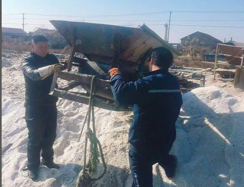 在海洲灣公司的海濱三組原鹽集運(yùn)現(xiàn)場(chǎng),過(guò)河原鹽皮帶機(jī)滾籠上的鋼筋因機(jī)械疲勞斷裂造成無(wú)法運(yùn)轉(zhuǎn)。為了不影響原鹽集運(yùn),接到通知后,機(jī)械班維修人員冒著刺骨嚴(yán)寒迅速攜帶電焊機(jī)等維修工具趕到現(xiàn)場(chǎng)。露天下,檢查拆卸、焊接加固、安裝調(diào)試一氣呵成,很快機(jī)械又重新運(yùn)轉(zhuǎn)起來(lái)。