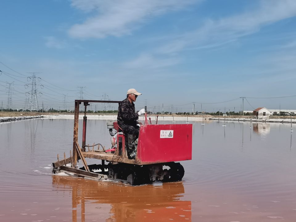 此時(shí)的鹽層大約已有五六厘米厚,若想長出晶瑩剔透的大顆粒晶體鹽,活碴作業(yè)是必不可少的。每日清晨6點(diǎn),昌圩班組、先鋒班組、大浦班組準(zhǔn)時(shí)有一名工人駕駛活碴機(jī),對(duì)鹽池板進(jìn)行破碎翻動(dòng),保持鹽層的疏松和顆粒間一定的間隙,確保晶體長得既快又好。通過活碴,鹽顆粒散亂在池底,經(jīng)過陽光照射會(huì)產(chǎn)生不規(guī)則的反射,大大減少了光線反射回水面的概率,易于提高鹵水溫度,增大鹵水蒸發(fā)量,從而增加原鹽的產(chǎn)量。
