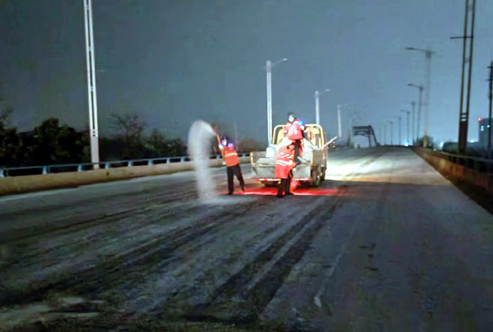 為做好本次除雪工作,悅升公司第一時間啟動應急預案,安排好值守人員,傍晚前在新區(qū)、板橋工業(yè)園區(qū)重點道路橋段預先配備好融雪劑等物資。凌晨3時許,大雪越下越大,悅升公司值守人員兵分10路,相繼對出現(xiàn)冰凍重要路段開展拋灑融雪劑等工作。